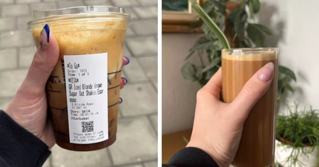 To recreate this drink, gather ice, a cocktail shaker, coffee, brown sugar, and oat milk. This recipe is inspired by Starbucks’ official website.